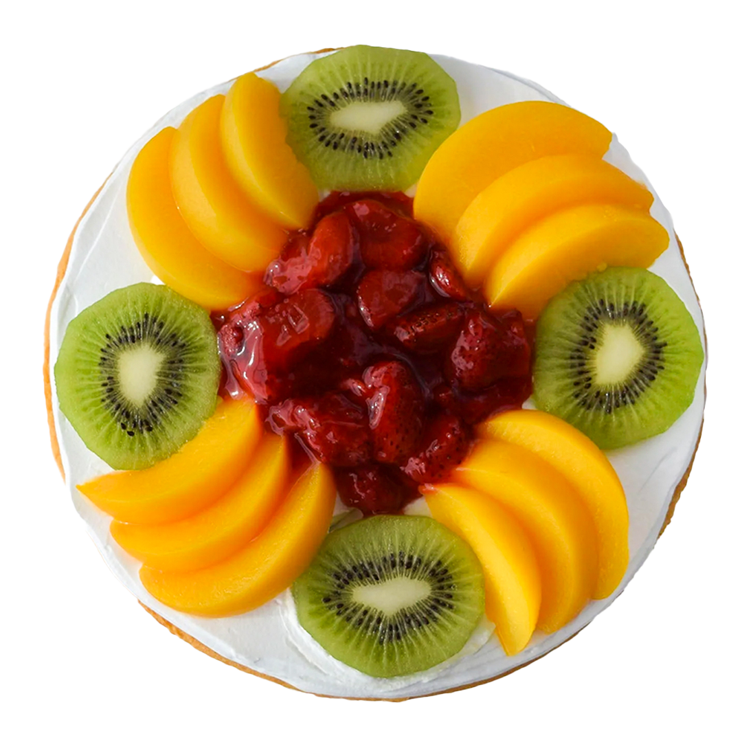 Pan de vainilla, relleno de fresa, plátano y crema chantillí, cubierto de frutas.